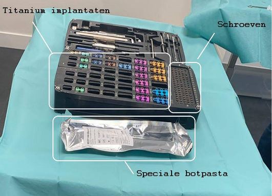 Hierna maken wij voorzichtig ruimte voor het implantaat dat wij rustig ertussen schuiven. Door middel van schroeven wordt het implantaat goed op zijn plek gehouden. De ruimte die tussen het bot is ontstaan vullen wij op met een speciale pasta om snelle botgenezing te verzorgen.